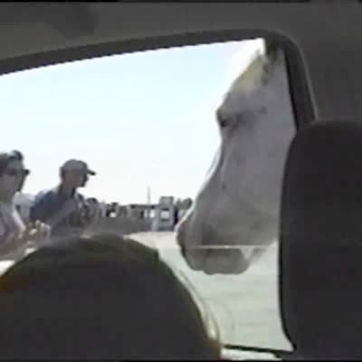 "Horse Hock" Teens in back of car at beach feed bananas to wild horses that stick their heads in the car windows. A horse coughs up some banana on teen girl.