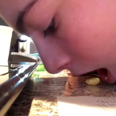 "Centipede Surprise" A man pretends to eat a fake centipede indoors and his tot daughter gasps and looks down his throat to find it when her dad coughs and pretends he coughed it back up.