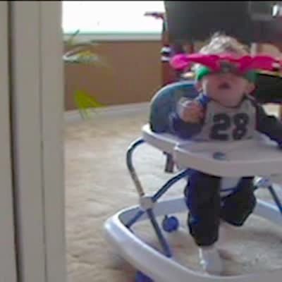 Baby boy wears Christmas reindeer antlers in his walker chair. He coughs, the antlers fall off and the band covers his eyes making it look like the antlers are really long eyelashes. MUSIC EDITED ONTO CLIP.
