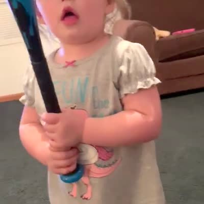 A tot girl holds a baseball bat in a living room and whenever her father tells her to "Choke Up" and move her hands farther apart she coughs.
