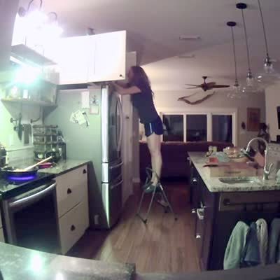 A woman uses a step ladder to get a crock pot out of a top cabinet while she is on a video chat. Stepping of the ladder, she then trips over the legs of the ladder and face-plants onto the kitchen floor. The crock pot tumbles from the counter and falls on top of her. A dog comes into the kitchen to check on her. Security footage.