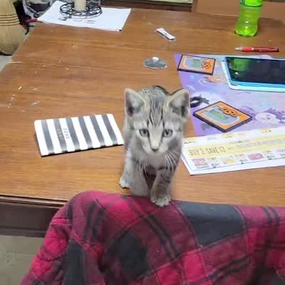 A kitten cat tries to jump from an office chair to a kitchen counter but she hits the counter and falls down hard.