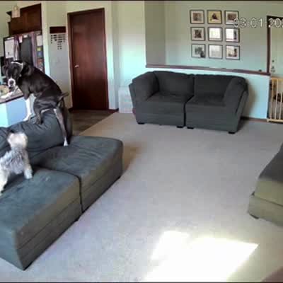 A dog attempts to climb from a living room couch onto a kitchen counter, when he struggles then slips and falls to the floor on his back. Security footage.