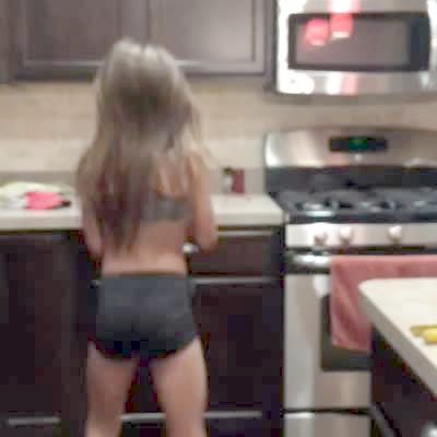 A teen girl dances on the counter, and when he tries to get down she slips and her shorts catch on a cabinet door giving her a wedgie. The door flies open and she hangs in the air for several painful seconds.