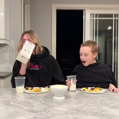 A boy and a teen girl, his baby sitter, do the Borrowed Hands Challenge, sitting at a counter eating macaroni, grapes, pineapple, cookies and drinking milk from the carton.