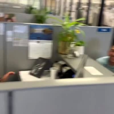 A woman walks into an office building. A man hides behind a counter and jumps out and scares her. She falls to the floor. Security footage.