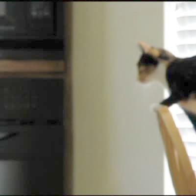 Cat leaps from table to a scotch tape covered counter top and falls off. Funny walk.