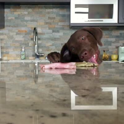"Canine Counter Intelligence" A Chocolate Labrador dog reaches far with his paw onto a counter to take food that is sitting out.
