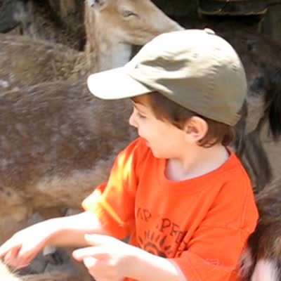 Tot boy counts deer at petting zoo, a deer jumps & knocks boy down. Short tails - mom turned off the camera.