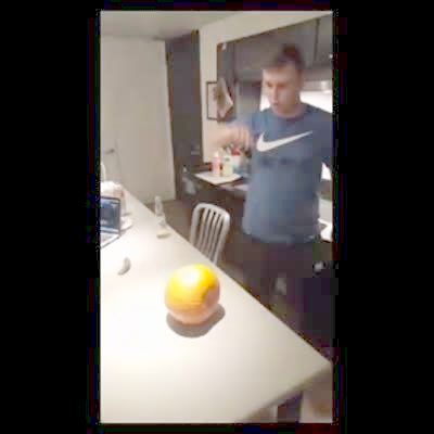 A man has another man count down for him before attempting to smash a pumpkin with his head. He goes for it and doesn't end up smashing the pumpkin, just hurting his head.
