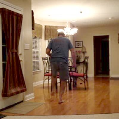 Man dances on hardwood floor to country music and pours water on himself. He slips and falls down. Bonehead.