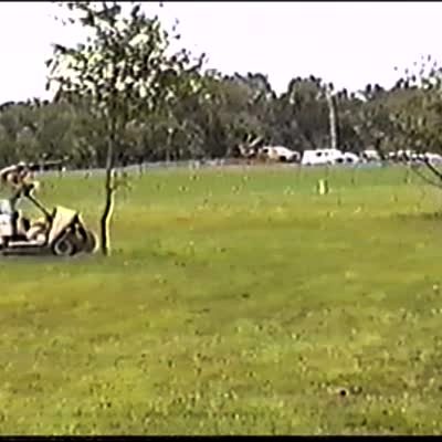Two teen boys ride a lawn mower and try to do a wheelie. Boy's leg gets stuck on the tractor and he gets dragged across the grass.