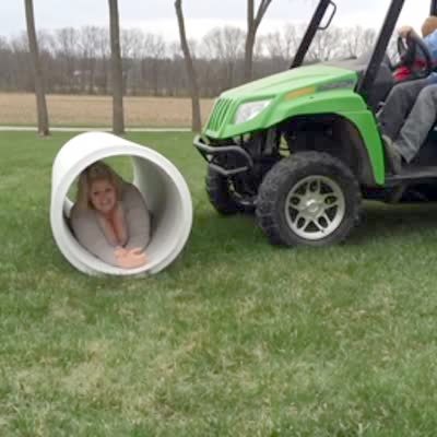 A tot boy rolls a woman in a construction tube before a man takes the boy on his ATV and pushes the tube with the vehicle while the woman screams.