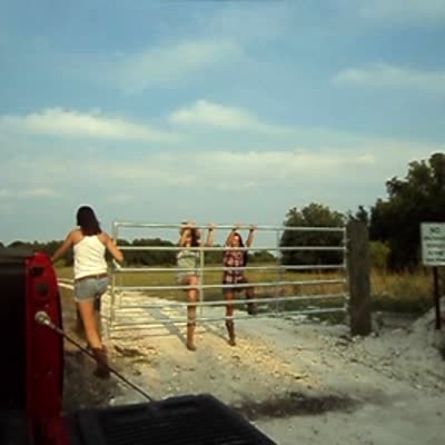 Three teen girls stand on a gate on a country road as it swings open. The gate falls off its hinges and the girls fall. Short tails. Caucasian.