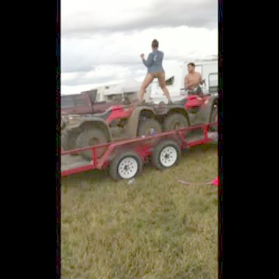 A drunk young woman flips backwards dancing on a truck bed outdoors to country music.