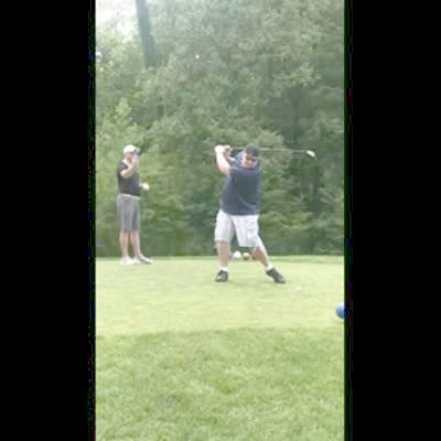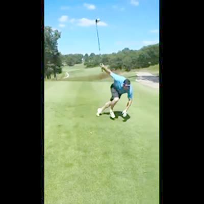 A man tries on the golf course tries to imitate a golf swing from the movie 'Happy Gilmore' and falls down into the green.