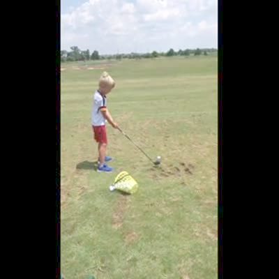 A young boy tries to hit a golf ball at a golf course and accidentally hits the whole bucket behind him.