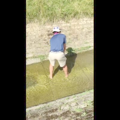 A man struggles to hit a golf ball out of a stream at a golf course. Eventually, he slips when he swings and falls in the water.
