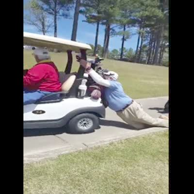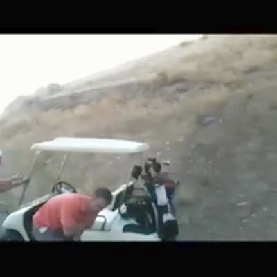 A man loses control of a golf cart and rolls backwards down a hill at a golf course. Then he jumps out and the cart crashes into trees.