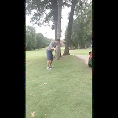A man hits a golf ball at a tree on a golf course and it bounces off and hits him in the groin.