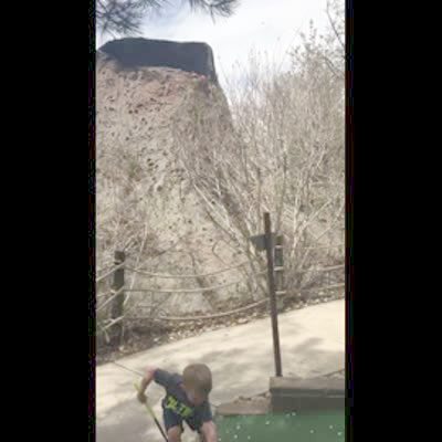 A young boy at a miniature golf course runs scared after a fake volcano behind him erupts.