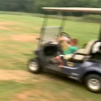 A tot boy drives a golf cart on a golf course, and a man screams for him to step on the breaks as a young boy chases after him.