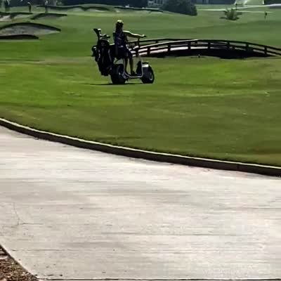 A woman drives a scooter around on a golf course. She crashes and falls and another woman curses.
