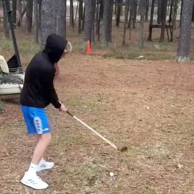 A man stands between trees on a hill off the side of a golf course to hit a golf ball. He hits the ball and it bounces off a tree and goes backwards and hits the man with the camera.