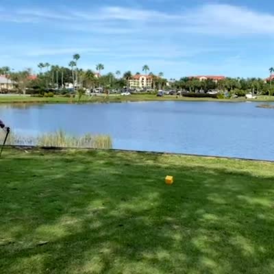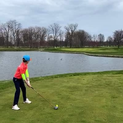A young boy hits a golf ball, it bounces off a lake and a retaining wall around it, then flies through the air and lands back in front of him at a golf course.