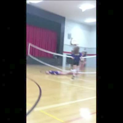 A teen girl falls when trying to jump over a volleyball net in a gym.