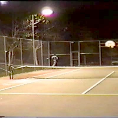 Two men play tennis in the yard and one of them trips and falls into the net. Music rights not cleared.