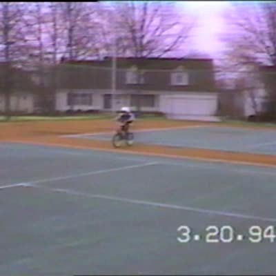 A young boy on a bicycle with training wheels runs into the fence while riding on a tennis court.