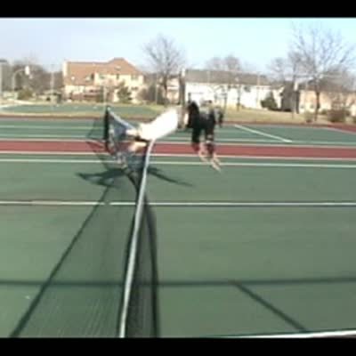Man watches buddy jump over tennis net 2x, thinks he can do it, falls over it hard. Bonehead.