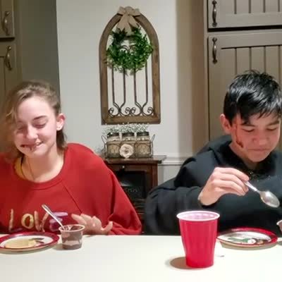 A teen boy and a teen girl play the Borrowed Hands Challenge in the kitchen. They both get food all over their faces. They laugh. The boy gets pudding in his eye.