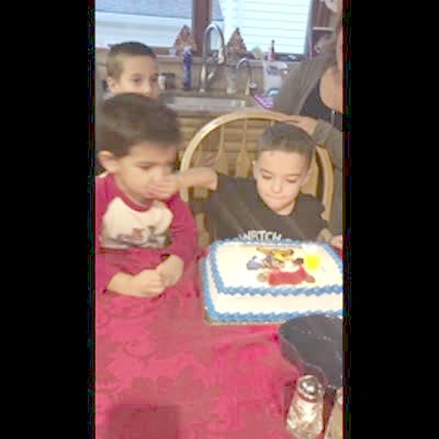 A tot boy gets ready to blow out candles on a birthday cake at a kitchen table with his family. His tot boy nephew tries to blow out the candles and the birthday boy covers his mouth and pushes him away and the nephew cries. They light a candle for the nephew to blow out and the birthday boy gives him a thumbs down.
