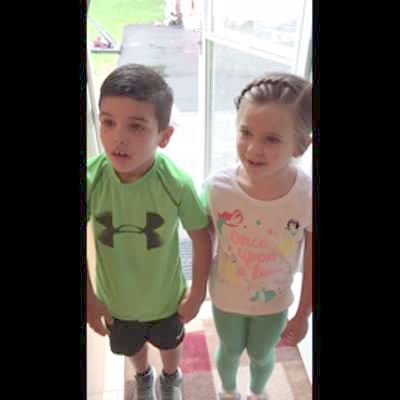 A young girl and young boy dance in a road and an even younger boy in a diaper walks in front of the camera and dances as well. Music rights not cleared.
