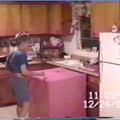 Surprise Christmas gift. Teen opens big box, surprised by cousin inside. He punches and wrestles with him on kitchen floor.