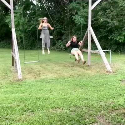 Two teen girls swing on a wooden swing set in the backyard, but a rope breaks, and one teen girl falls on the grass.