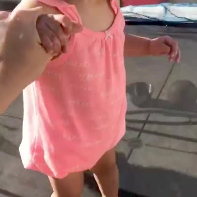 A tot girl stands on a trampoline while a dog walks around and barks underneath. Her older cousin then shouts "you're ruining a family moment!"