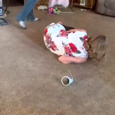 Ice cube falls down inside tot boy's diaper. girl cousin pulls it out from his butt area, then it falls on the kitchen floor. then she puts it in her mouth.