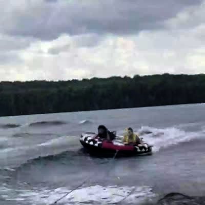 Two women ride an inflatable tube tied to a boat on a lake, then it bounces up, and they fall in the water.