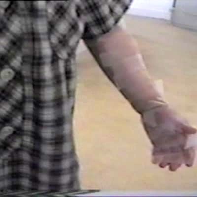 A man gets his overalls stuck on a door handle as he tries to leave the house, so he calls his wife but manages to break free. Security footage.