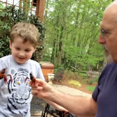 A man lifts up his shirt and lets a crayfish pinch his nipple while he's on a boat. Featured talent cleared (man being pinched).