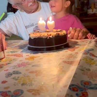 A tot girl sings "Happy Birthday to a senior man in a dining room. Then she holds his face away and blows out his birthday candles.