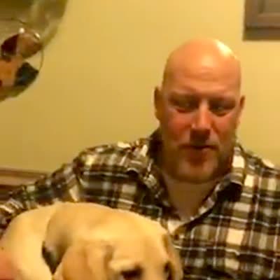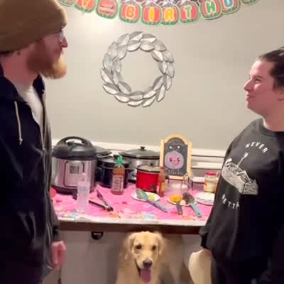 A man holds a miniature Pinscher dog while a woman turns the crank of the game "Pie Face" in a dining room, then the dog gets a small amount of whipped cream, and the rest of it lands on the man's forehead.