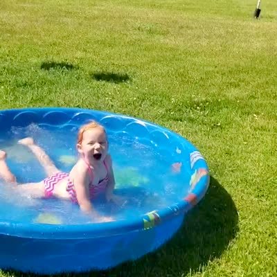 A young kid tells a tot girl to do a belly flop into a kiddie pool in a yard. She does it with an ice cream cone still in her hand. The tot girl stands up in the pool and continues to eat the ice cream. The young boy yells "oh my God!"