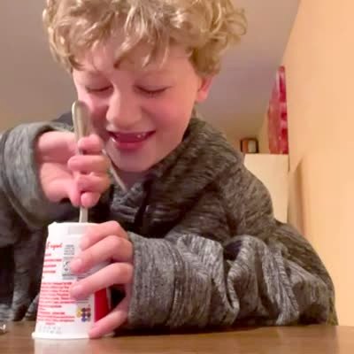 A young boy does the Borrowed Hands Challenge and eats yogurt in the dining room.