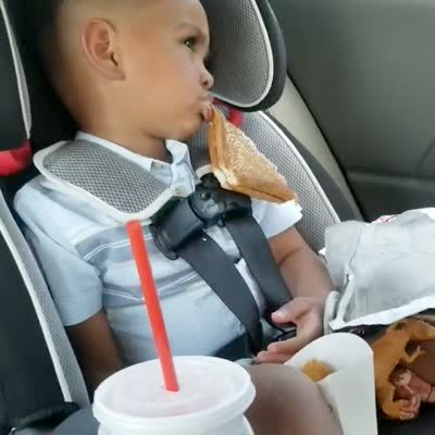 A tot boy sleeps with a grilled cheese sandwich in his mouth while in the backseat of a car.