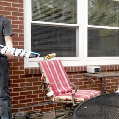 A teen boy showers a man with toilet paper attached to a leave blower outdoors.