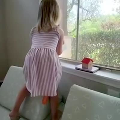 A grandmother points out a ladybug on a windowsill to her young granddaughter, and the baby girl puts it on her finger and tries to eat it, but the woman stops her.